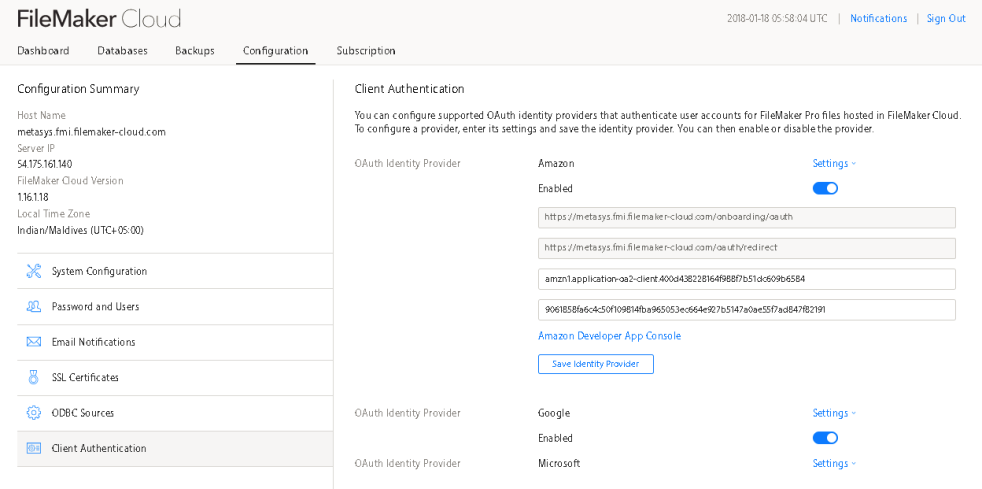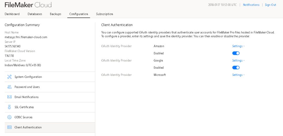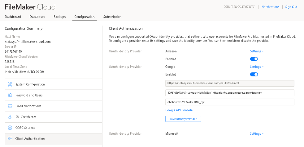 Enabling EA on FileMaker Cloud: In this case, you need to login to Admin Console of FileMaker Cloud and then you can go to Configuration>> Client Authentication, and from there you can enable OAuth Identity Providers.