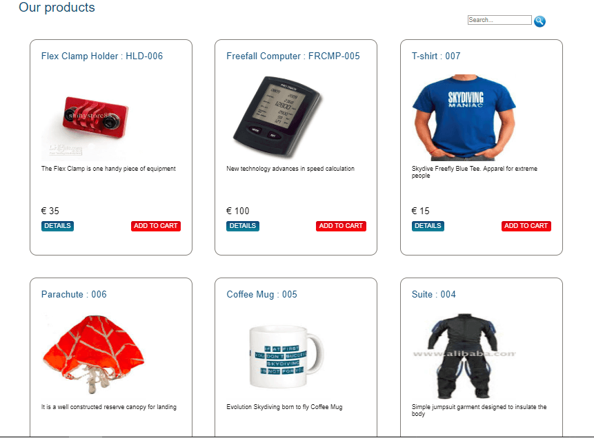 Users register/login to the site and book their desired date and time slots for their skydiving experience. The reservation module uses the calendar tool to indicate available slots. The application generates an invoice and sends the user a notification by email. They can also buy merchandise via an online catalog and shopping cart. Payment gateway integration is also incorporated into the application. The application has a user portal, where registered users can view their reservations, packages, profile and purchases. The admin module allows for the creation of Master data.