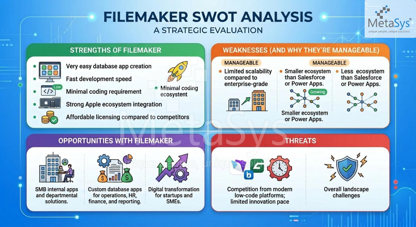 FileMaker is the ideal low-code platform for SMBs and departmental teams that need fast, affordable, and easy-to-use app development. While enterprise platforms like Salesforce, Quickbase, Zoho Creator, and Power Apps dominate large-scale deployments, FileMaker stands out for its cost efficiency, usability, and rapid development speed.