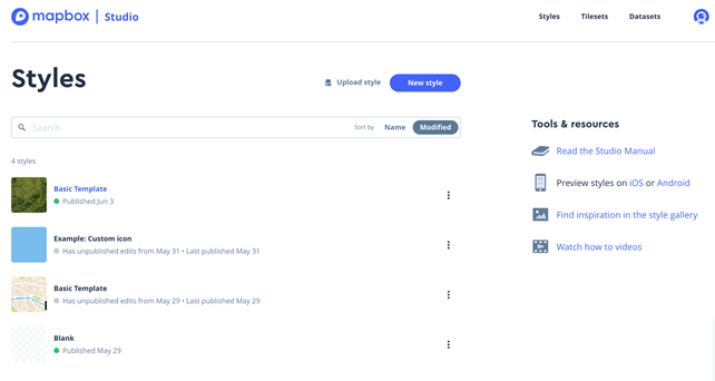- c.After opening the Mapbox studio, you can see the predefined styles you can use directly or you may choose to create a new style.