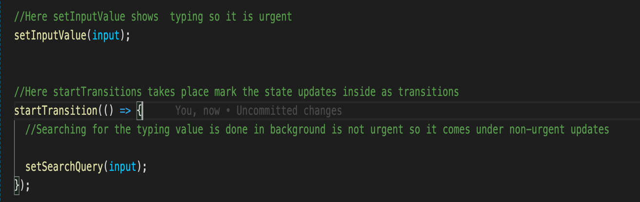 - startTransitions: startTransitions is a method to initialize start transition where hooks can’t be used. Below is the example for startTransition where you can put your code which is non-vital to the end user.