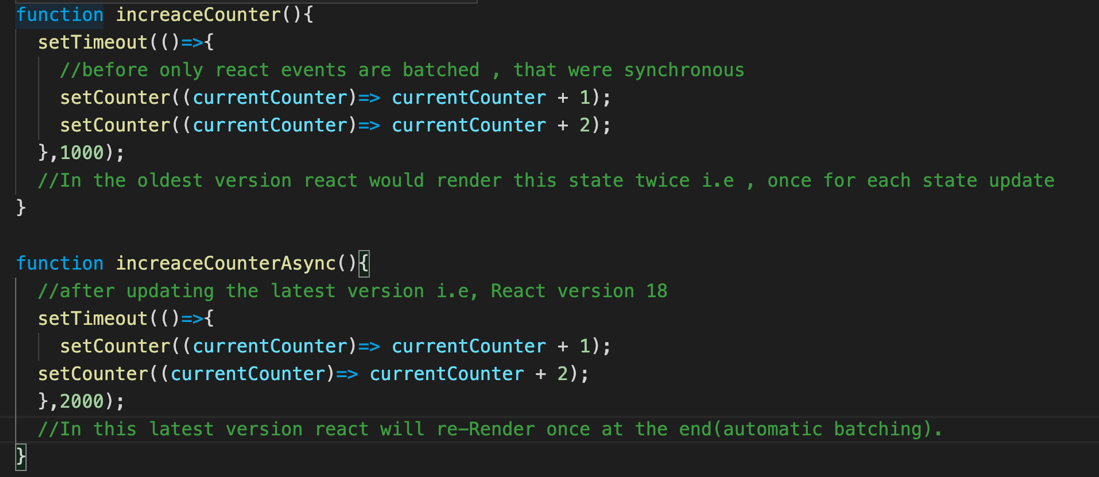 Batching is one of the React features that combines all the updated states in a single update. Batched updates can be performed inside React event handlers, i.e., it only worked inside the synchronous React event handlers functions. These changes were made in React version 18 with automatic batching.In the example code below, it shows how the automatic batching helps to stop re-rendering the set Counter () function twice.